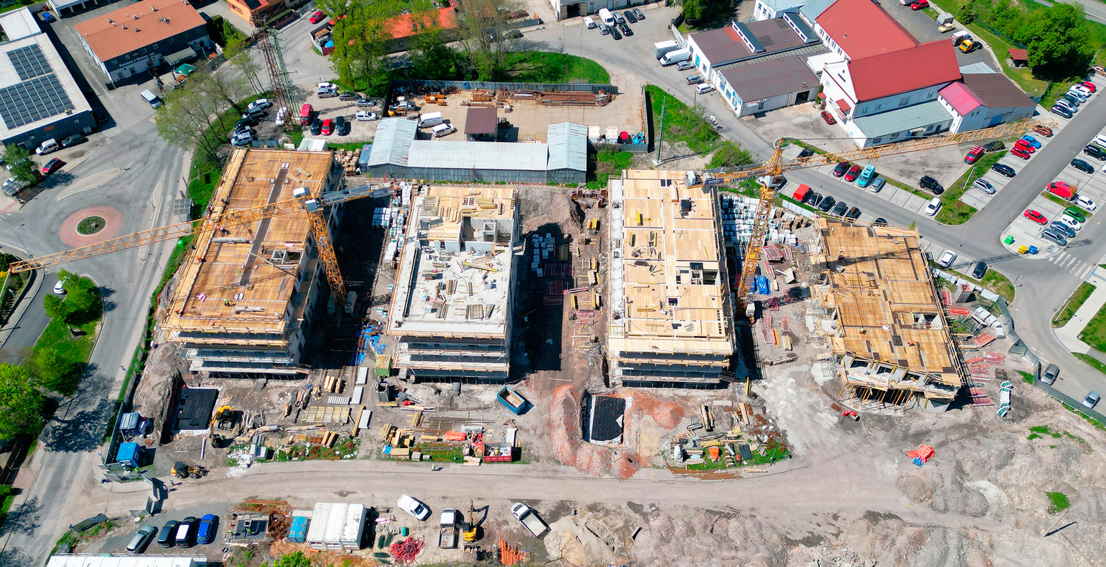 On the first building, the ceiling slab of the 4th floor has been completed, the first prefabricated bathrooms have been installed, and work on technical utility shafts (MEP systems) is actively ongoing. The second building is currently being prepared for the casting of the 5th floor ceiling slab. Here, too, the bathrooms have already been installed and MEP installations are progressing according to plan.