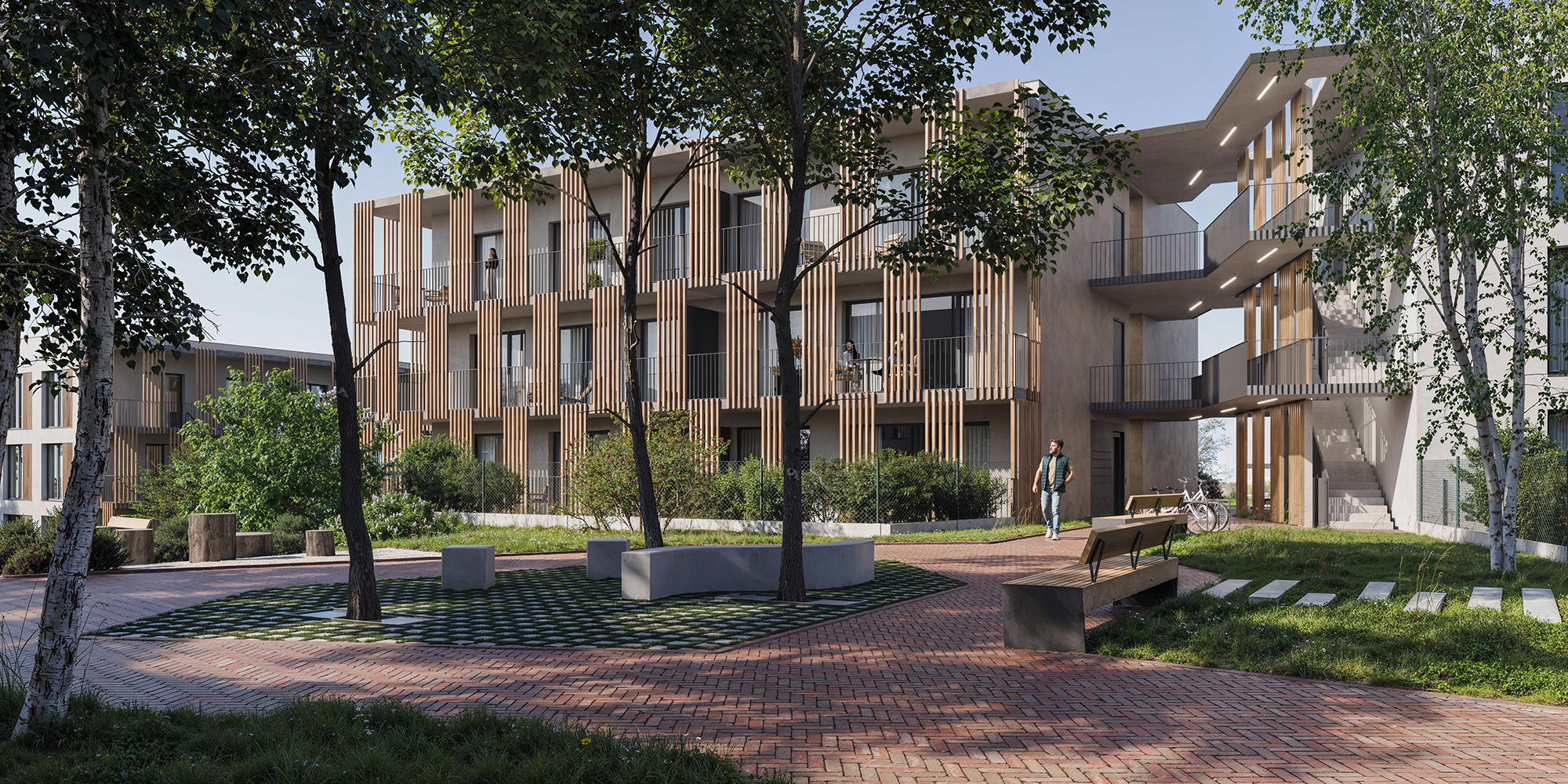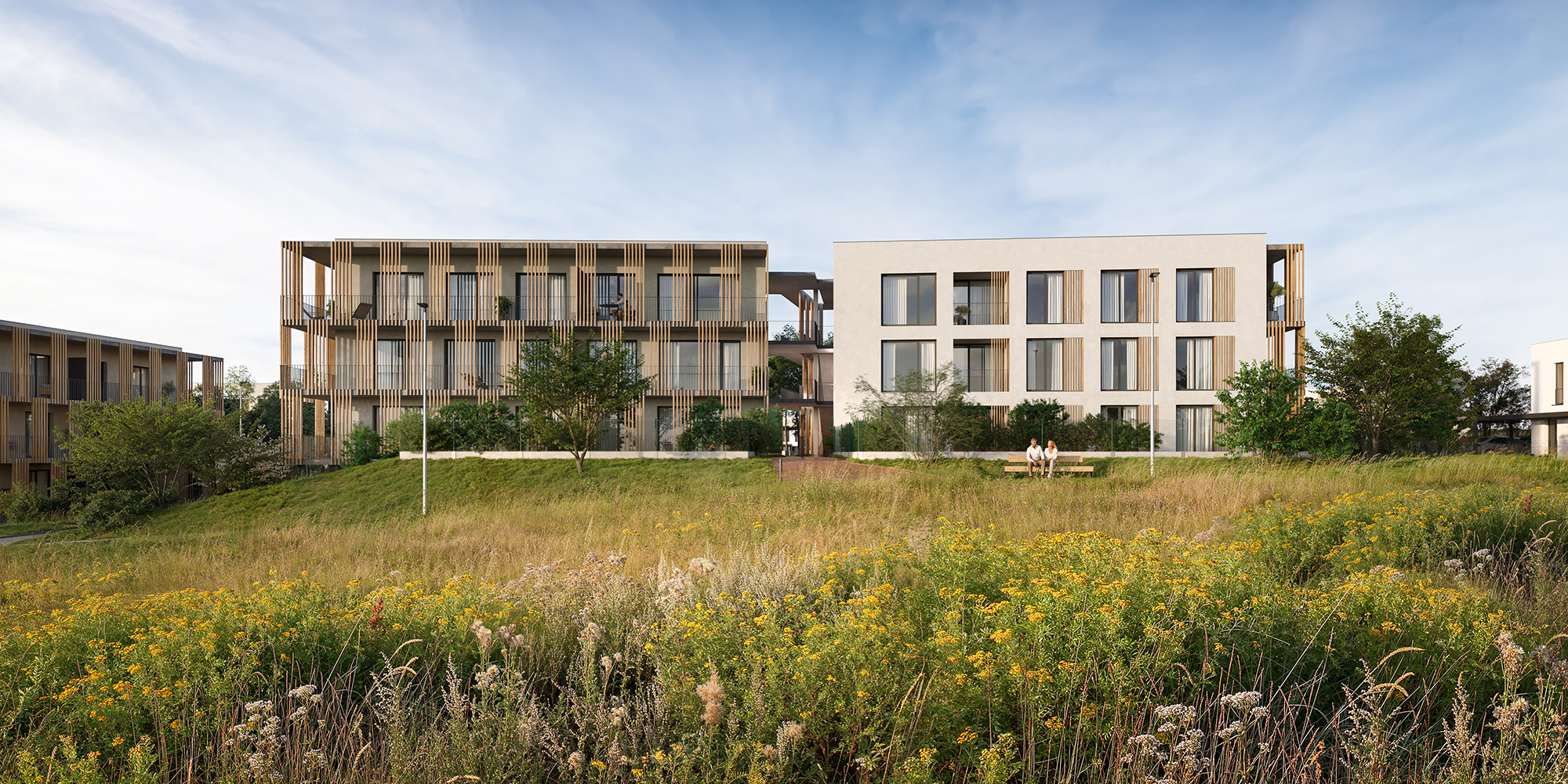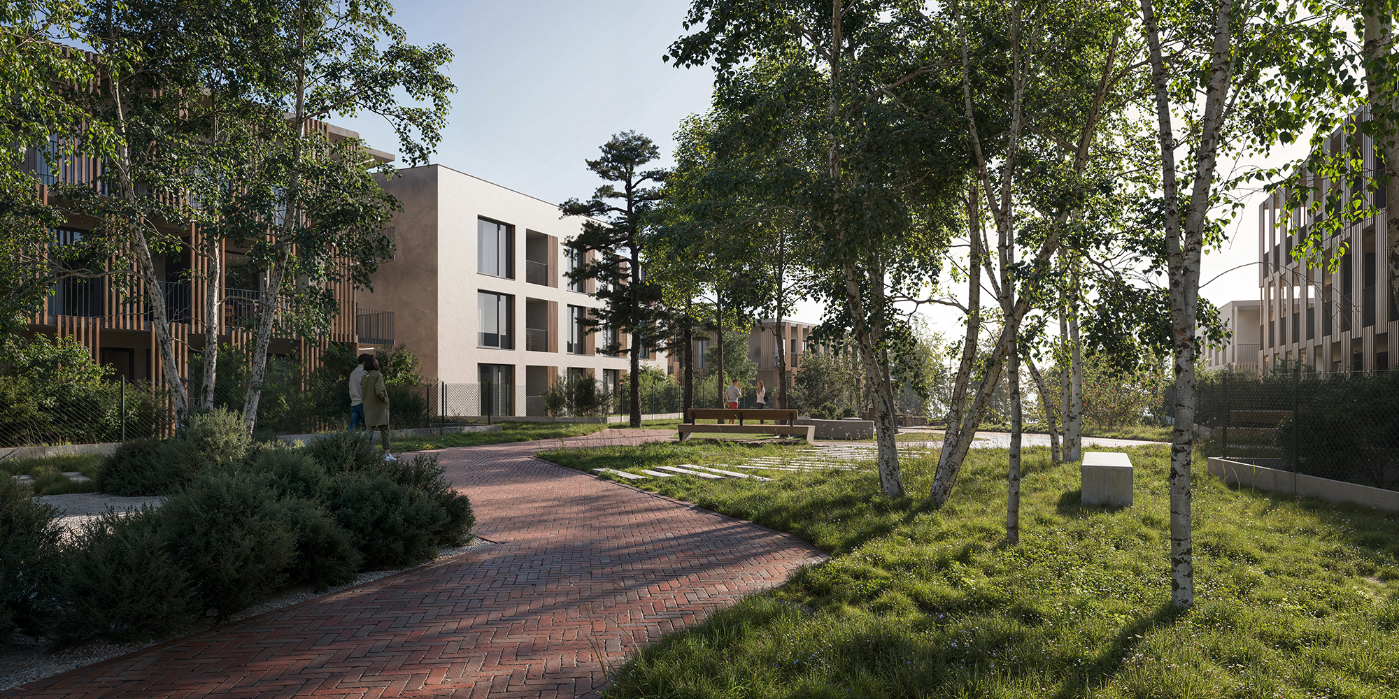 Meander Kbely má svůj osobitý genius loci. Přináší klid, který vyvěrá z okolní krajiny a rytmus, jenž plyne z přirozeného propojení prostoru s přírodou. Architektura navazuje na ráz místa - linií budov, průhledy do zeleně a citlivou prací s denním světlem. Moderní tvary doplňuje dřevěné obložení, které domům dodává hřejivost a nadčasový charakter. Vzniká tak prostředí, které skutečně dýchá. Je funkční, estetické a přátelské. Je to místo pro každodenní život, pro sousedská setkání i pro hry těch nejmenších. Meander Kbely je skutečným domovem.